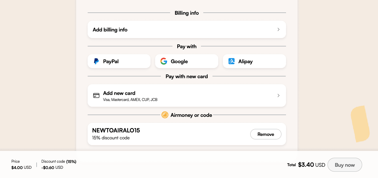 After creating your account, return to our website and click the additional 15% off link (you can also find it here). Existing users can use this link to get 10% off. Once you select your plan, you should see the discount code automatically applied, as shown above. After confirming the details, you can complete your payment, and congratulations! You’ve successfully purchased your eSIM.