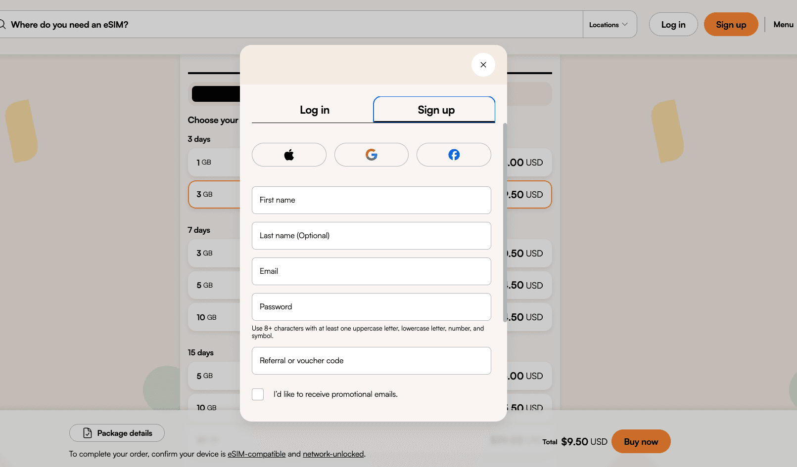After selecting your plan, tap Buy Now. You’ll be prompted to either create a new account (if you don’t already have one) or log in to your existing account. Please note that an account is required to purchase an Airalo eSIM.