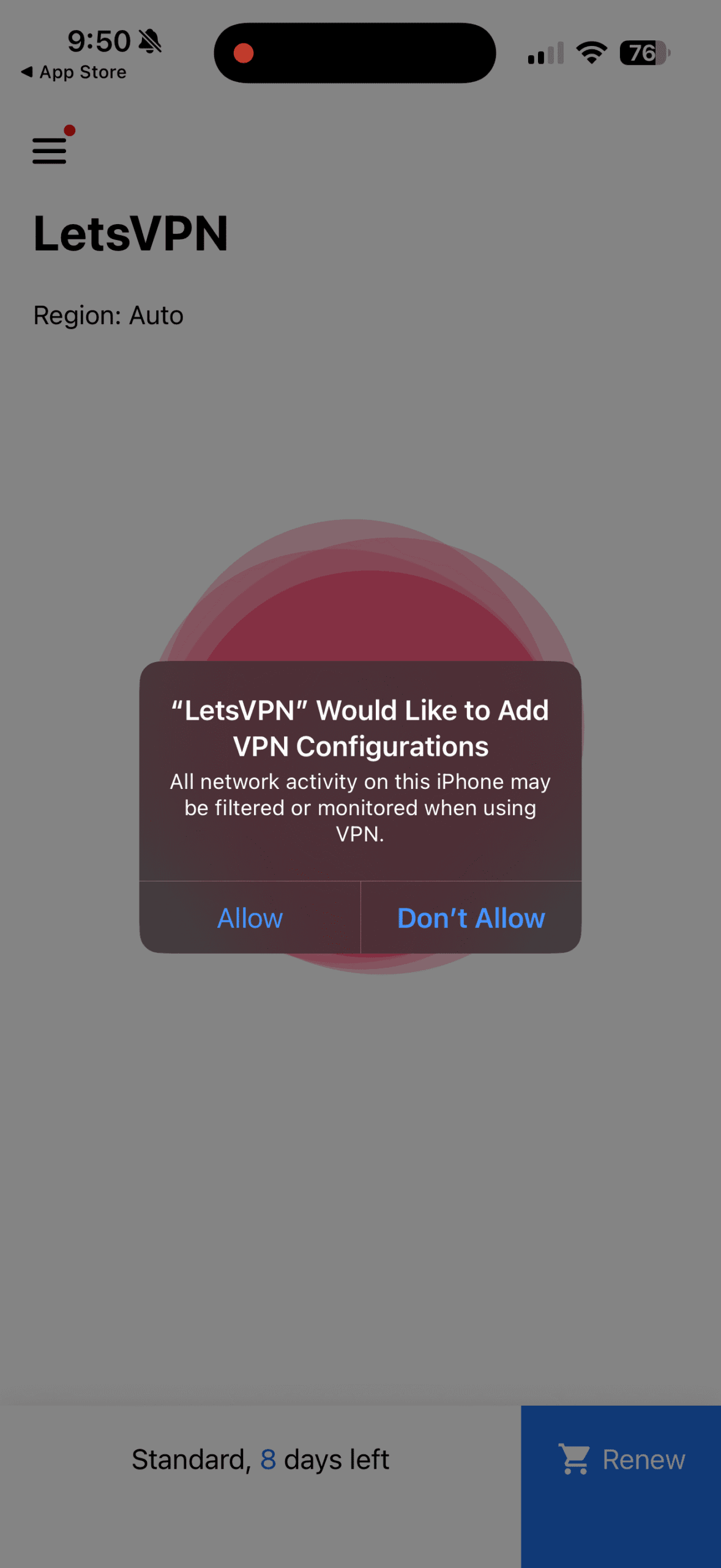Once choosing the , it will guide you through the setup process, just follow the on-screen instructions. The key step is allowing LetsVPN to be added to your device’s VPN configuration, which is required for the VPN to work. You can review this later in General → VPN & Device Management. Once LetsVPN is added, your VPN is fully set up and ready to activate whenever you need it.